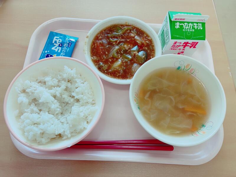 【鉄分アップ献立】麦ごはん マーボーナス あさりとキャベツのスープ かつおふりかけ 牛乳