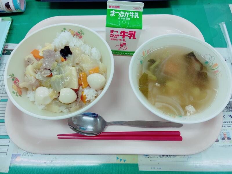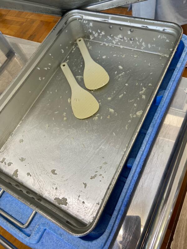 今日は2班さんお当番2週目。どんぶりメニューの日は、大きなどんぶりを使用します。いつものごはん茶碗より大きいどんぶりによそうとついつい量が多くなって、足りなくなってしまうなんてこともたまにあります。大人数に配膳するのは結構難しい…。でも今日は「それじゃ多いんじゃない?」「これは少なすぎるよ」とお当番どうし声をかけながらよそっていました。そしてご飯も中華丼の具も全部ぴったりよそいきりました!すごーい!(拍手)