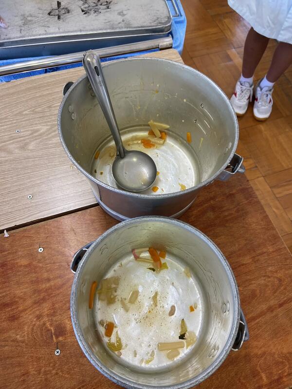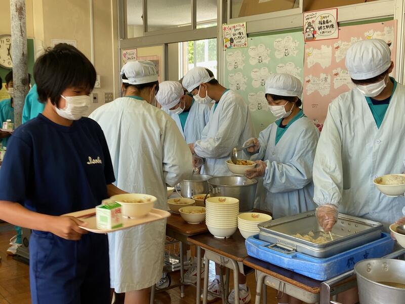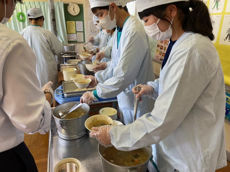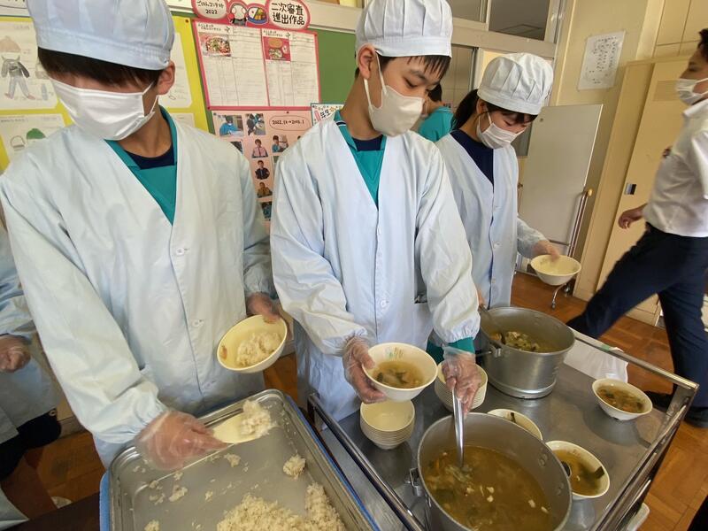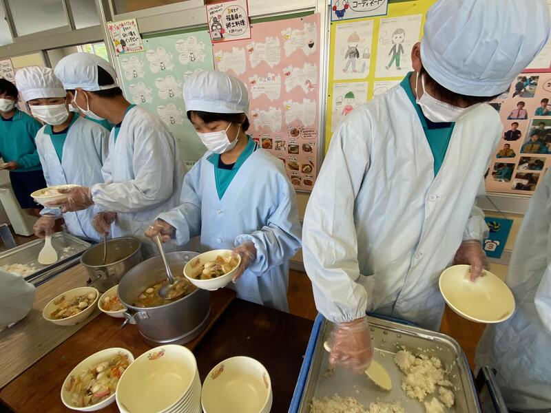今週の給食当番は2班さんです。前回は最後の方で汁物の具がなくなってしまったり、最初に配膳した人と後の方に配膳した人で全然盛りが違っていたり、ごはんをぎゅっと押し付けてよそったりと、いろいろ苦戦していましたが、今回はだいぶ上手になってきました。次の目標は「きれいに、早くよそうこと!」 日々修行★がんばろー!!