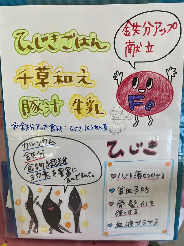 今日は暑かったですが、みんなひじきごはんをもりもり食べて、豆腐が入った豚汁を一滴残さずおかわりして、鉄分チャージは完了です('◇')ゞ