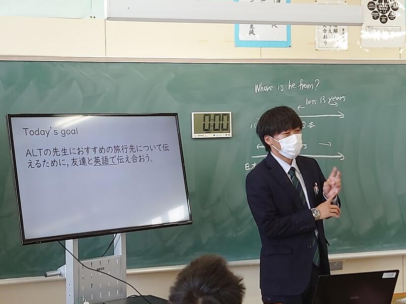 単元の最後に「ALTの先生におすすめの旅行先について伝える」ことを目標に、学習した文法を用いながら紹介したい場所についてペアで伝える練習をしました。