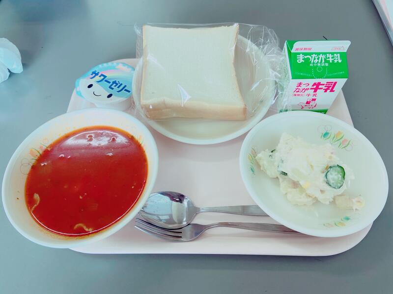 ツナポテサンド ポークビーンズ サワーゼリー 牛乳