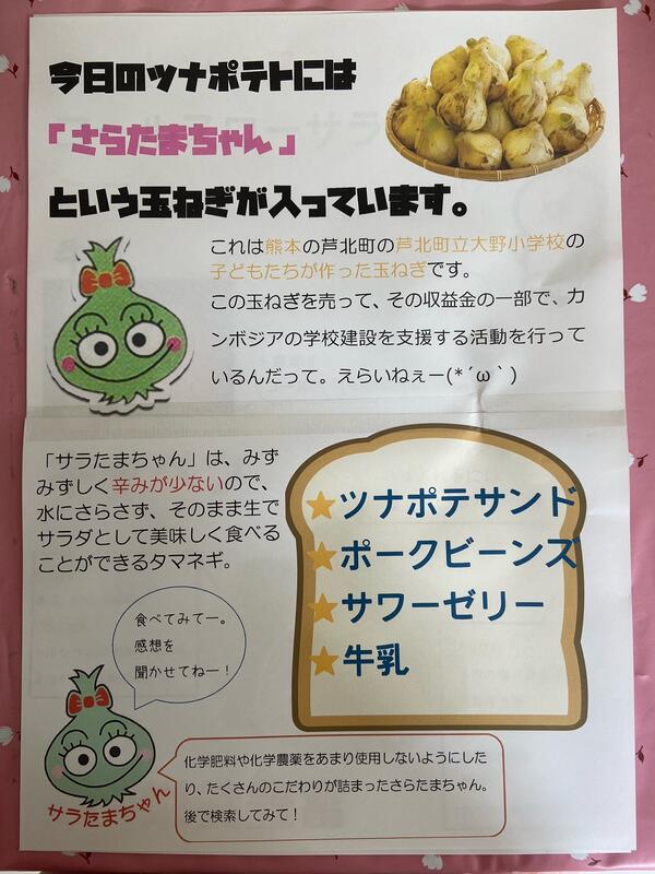 今日のツナポテサラダには「さらたまちゃん」という玉ねぎが入っていました。今回給食に使用した「さらたまちゃん」は、熊本県の芦北町立大野小学校の子どもたちが作った玉ねぎです。大野小学校の子どもたちはこの玉ねぎを売って、その収益金の一部で、カンボジアの学校建設を支援する活動を行っているそうです。