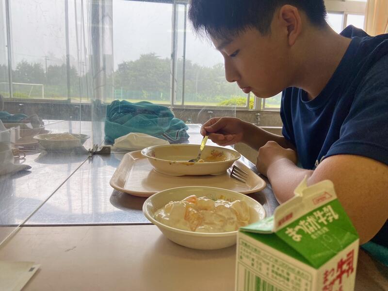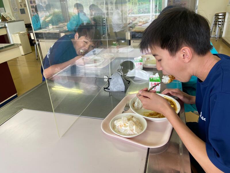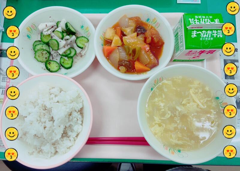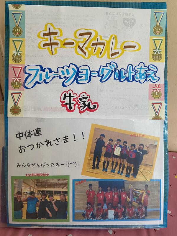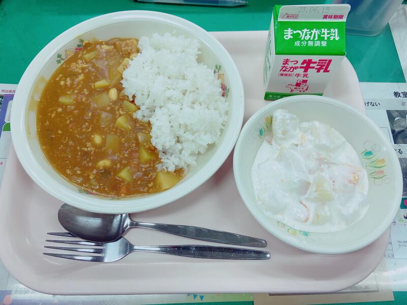 中体連が終わり、2日ぶりの給食はカレーとヨーグルト和えです! 頑張った後のカレーは格別!(^^)!