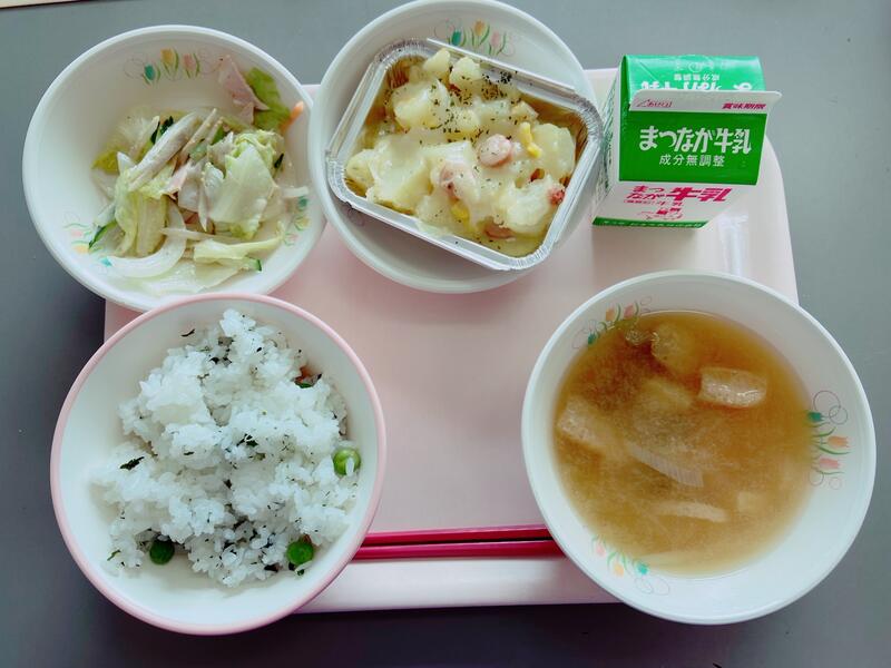 ピースごはん じゃがいものチーズ焼き 小松菜の味噌汁 ごぼうサラダ 牛乳