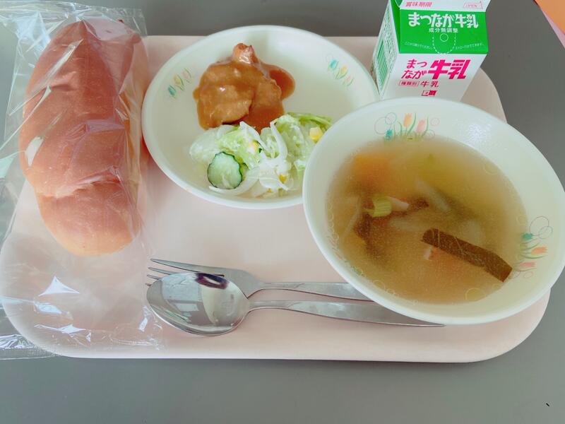 コッペパン タンドリーチキン グリーンサラダ アルファベットスープ 牛乳