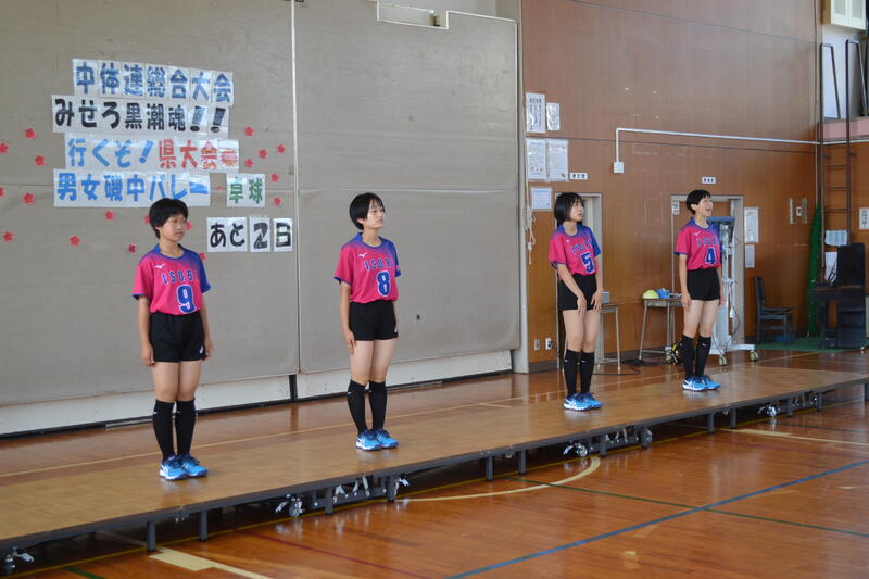 最後には、全員で輪になってお互いの健闘を祈るとともに、磯部中全員の気持ちを1つにすることができました。磯部中ならではのアットホームな壮行会となりました。