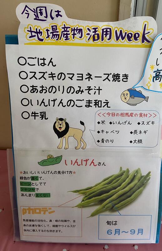 今日の給食の相馬産の食材は「米」「スズキ」「インゲン」「あおのり」「大根」「キャベツ」「長ネギ」でした。地元産のものはおいしいし、なんだかうれしい(^^♪