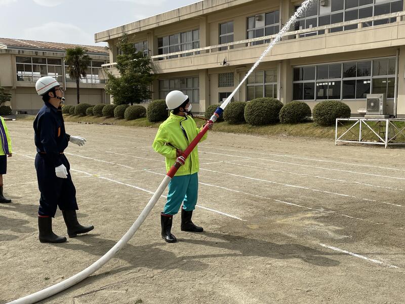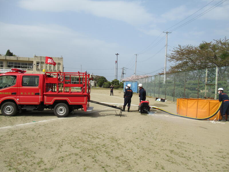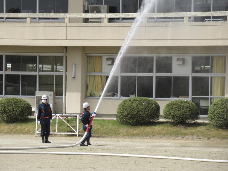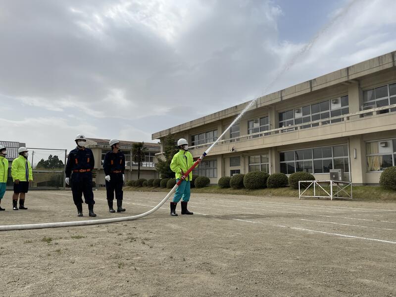 生徒の避難が完了後、第9分団の方々の放水訓練が行われました。