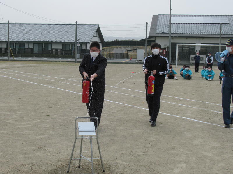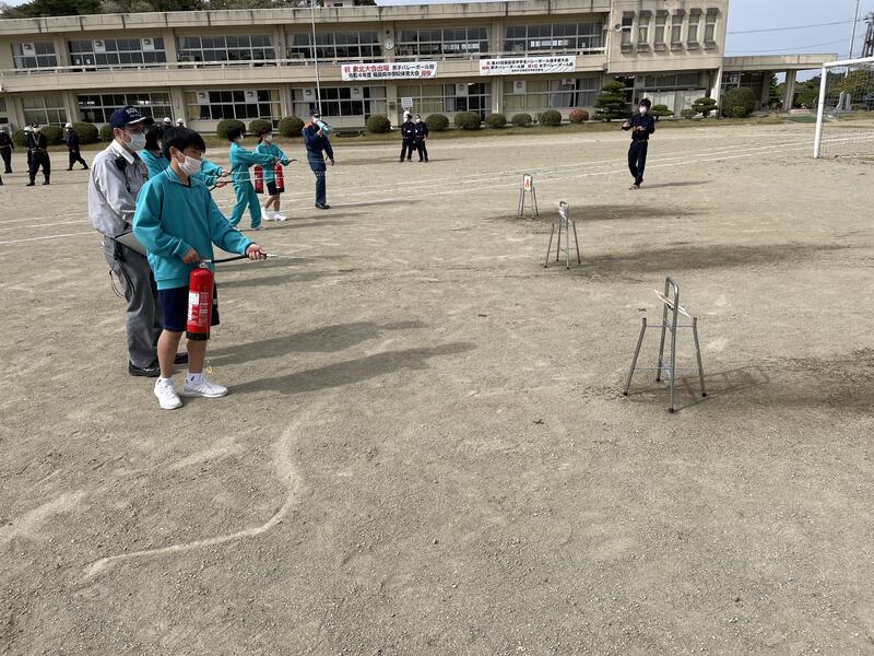 生徒たちも放水の体験、水消火器による消火訓練を行いました。