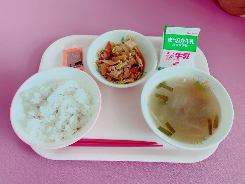 麦ごはん 回鍋肉 ひじきの佃煮 ワンタンスープ 牛乳