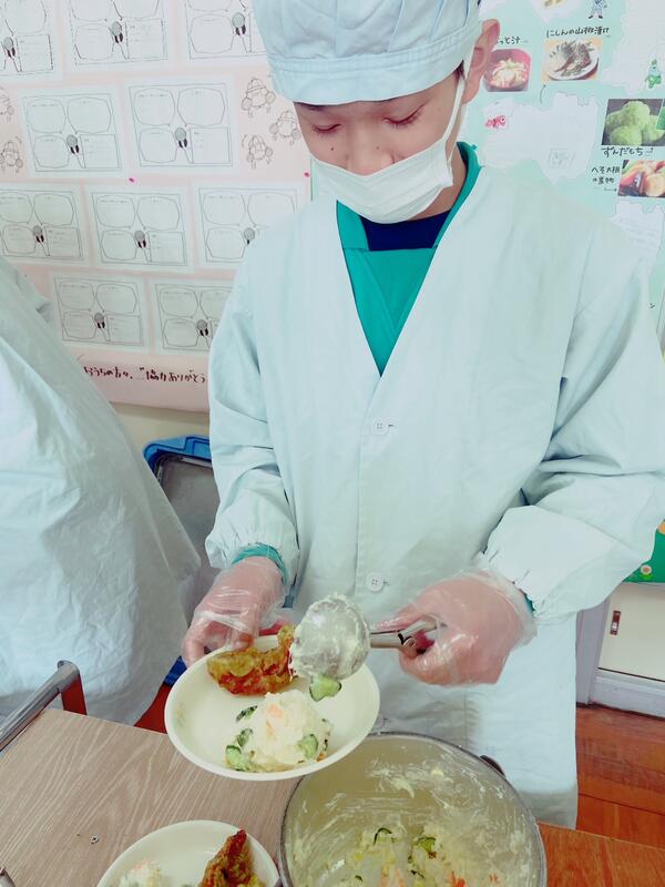 磯部中ではポテトサラダはマッシャーでお店屋さんみたいにおしゃれに丸く盛り付けます☆