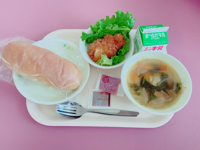 コッペパン チキンカツ 添え野菜 イタリアンスープ いちごジャム