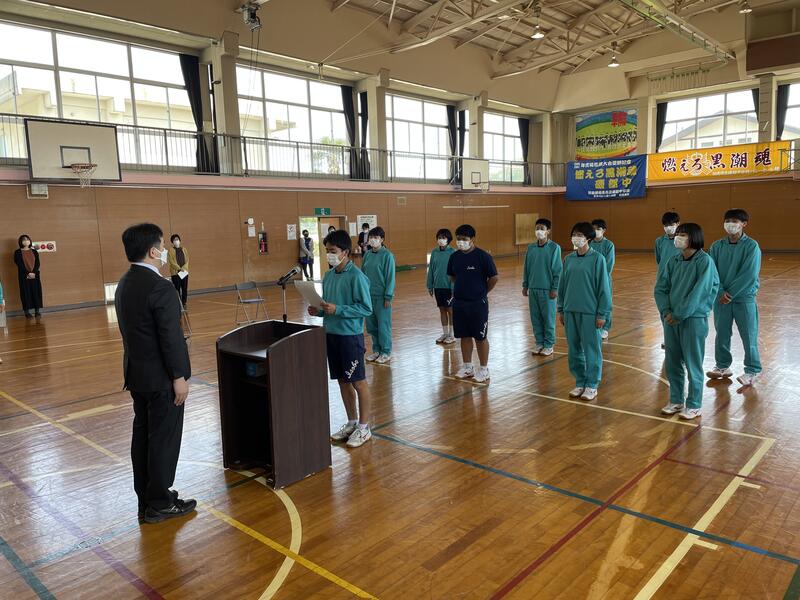 4月20日(木)に結団式を行いました。団長である校長より目的をお話ししたあとで、稲村さんが生徒代表あいさつを行いました。