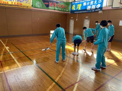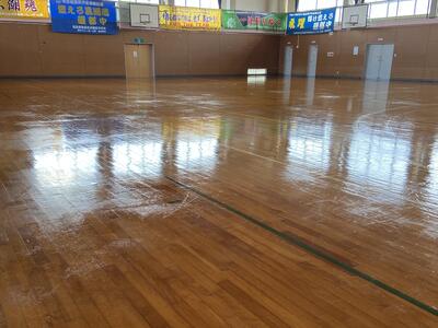 一方、2年生たちは、体育館のワックスがけを行ってくれました。床をかける姿が、さすがスポーツマンという感じで、かっこがいいですね。おかげで体育館の床がピカピカになりました。