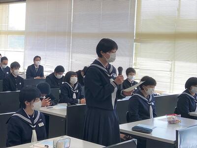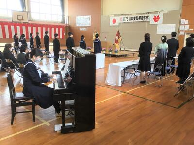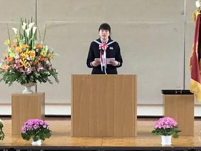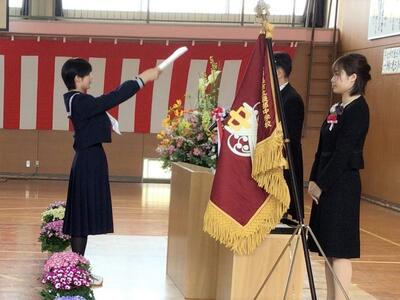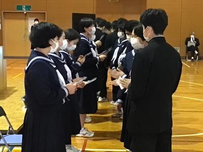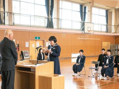 在校生を代表して荒さんが、「これから進まれる道では辛いことや苦しいことをたくさん経験されると思いますが、この学び舎で生活したことを思い出し、困難を乗り越えてください」と送辞を述べました。それに答えて、卒業生代表の蛯原さんは、仲間との思い出、先生方への感謝、後輩に託す思いを話したうえで、震災で大変な中、育ててくれたお父さん、お母さんへ「いつか立派な大人になって恩返しをします。」と、感謝の気持ちを述べました。卒業生、在校生、保護者、教職員のそれぞれの思いのこもった、感動的な式となりました。優しくて頼もしい3年生が巣立ち、明日から寂しくなります。