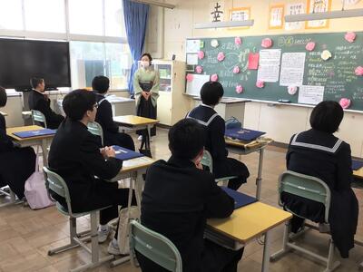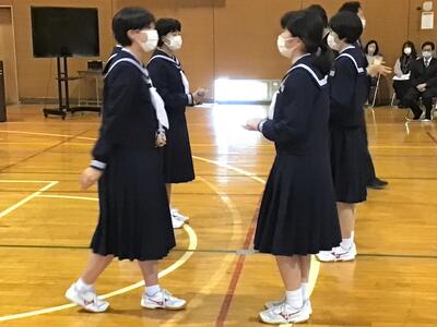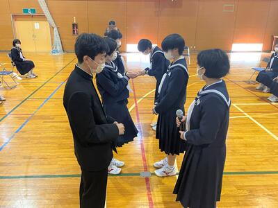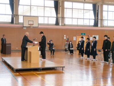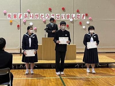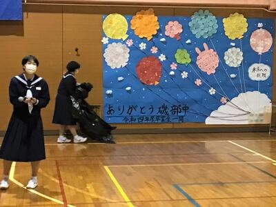 校長の話のあと、生徒会のバッジを新三役に引き継ぎました。生徒会長蛯原さんからは今年の生徒会活動への協力のお礼の言葉を述べ、この一年間で作った「磯部中未来への挑戦」を大きく掲示用にしたものを贈呈しました。次期生徒会長である2年荒さんから、3年生への感謝を述べ、1,2年生で作ったしおりやステッカーを3年生に贈りました。最後は、みんなで3年間のスライドショーを見て、思い出にひたるひと時となりました。