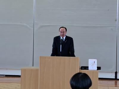 先に表彰伝達を行い、英検3級受賞者と、精勤賞(1年間無欠席)と皆勤賞(3年間無欠席)を表彰しました。このコロナ禍の3年間を無欠席で送ったことは素晴らしく、支えていただいた家族に感謝ですね。