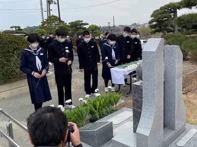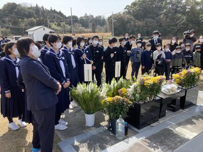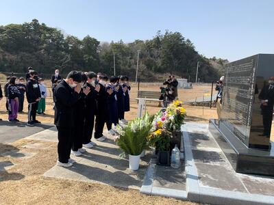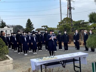 東日本大震災の日を前にした今日、本校の慰霊碑の前で、同窓会の皆様、相馬市教育委員会の皆様、PTA会長様のご臨席のもと慰霊式を執り行いました。校長式辞のあと、福地教育長のごあいさつをいただき、一人一人が慰霊碑に献花をしました。生徒代表誓いの言葉では、2年荒さんがその当時の記憶と、家族への感謝、そして災害から命を守るため、教訓をずっと伝えていくという覚悟を話しました。