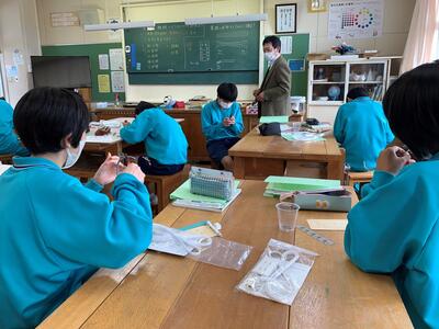 2年技術の授業では、「導線の処理をしてみよう」という授業の中で、テーブルタップ制作キットからコードを切り、中にある導線の数を真剣に数えていました。日常の生活の中にある機械部品の仕組みについて、学んでいました。
