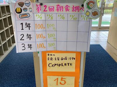 今週は朝食の摂取状況を自分手帳に記入しています。昨日、今日と朝食の接種率は100%でした。大変すばらしいと思います。しっかり朝食をとることで、学習効率もあがり、健やかな1日を送ることができます。主食、主菜、副菜、汁物とバランスのよい朝食が理想です。朝食に関するアンケート調査も行います。