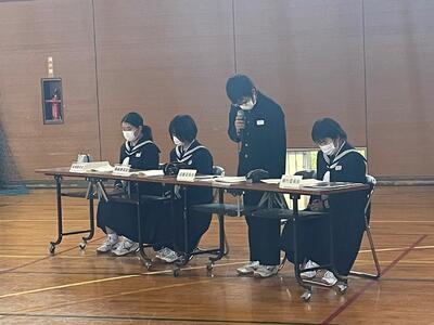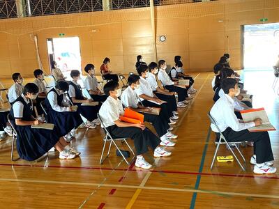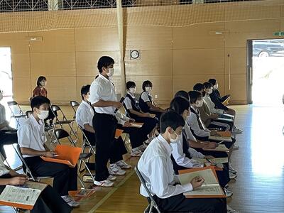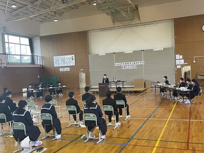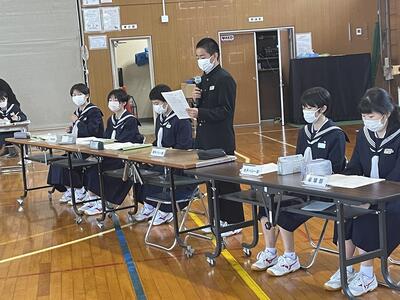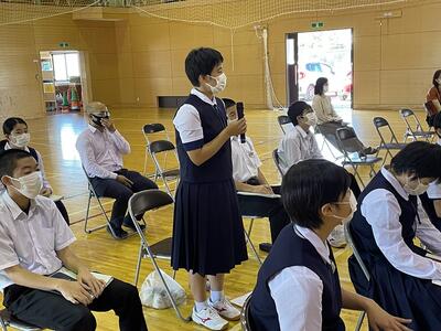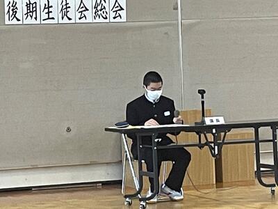 後期の専門委員会や部活動からの活動目標や活動計画を審議しました。議長の佐藤君の落ち着いた進行により、全体的にスムーズに議事進行ができました。子どもたちの発表力も上がってきているようです。生徒会長からは、まず、近づいてきている黒潮祭に向けてみんな一つになって、がんばっていきましょうと呼びかけがありました。