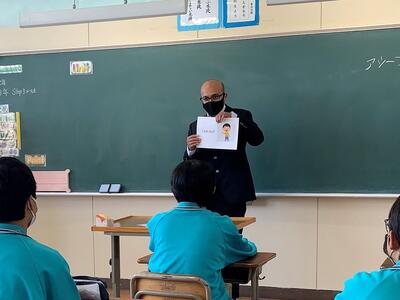 本校のALTとして、アシーフ・レザ先生が着任しました。バングラデシュ出身です。毎週木曜日、英語の授業に入っていただきます。写真は、3年生がアシーフ先生に質問している様子です。