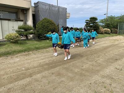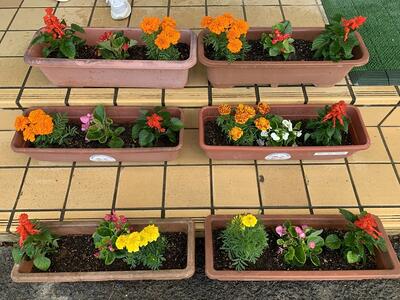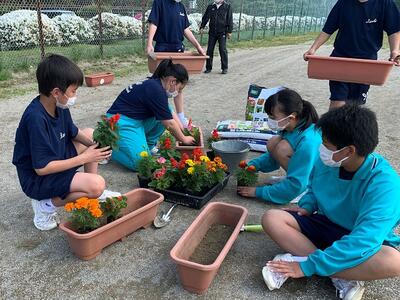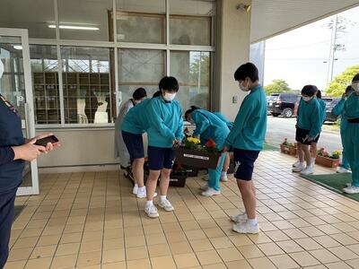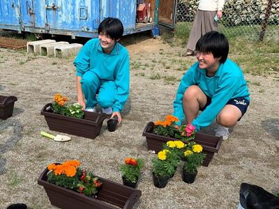 全校生でプランターに花を植えました。花を見て「きれい」と言える人の心も、きれいですね。校舎の周りを彩るだけでなく、隣の相馬井戸端長屋(災害公営住宅)にも贈呈する予定です。
