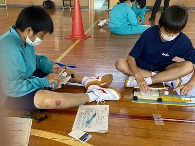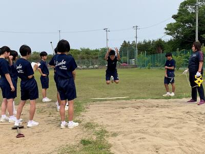2年生は陸上「走り幅跳び」の授業を行っていました。助走をつけない状態の立ち幅跳びから、3歩で踏み切って跳ぶという段階的な練習をしていました。