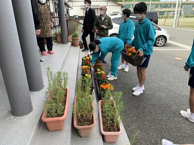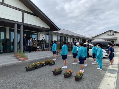 本日、生徒会役員とボランティアの生徒たちで、長屋に花を届けました。先日花いっぱい運動で植えたものです。毎年この時期に届けさせてもらっています。