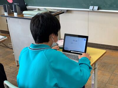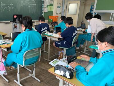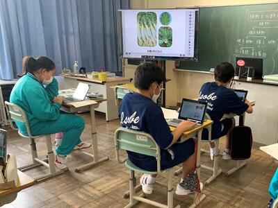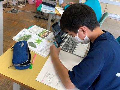 1人1台端末として、タブレットPCが整備されています。各教科の授業で、学びの質を高めるために活用を図ります。今日は、1年理科「植物の分類」の授業で、具体的な植物名から検索して、それがどの分類になるかを自分で調べていました。