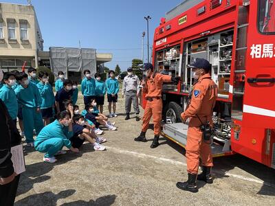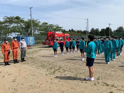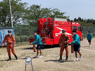 火災を想定した避難訓練を行いました。水消火器を使った消火作業を、相馬消防署員の方々にご指導いただきました。