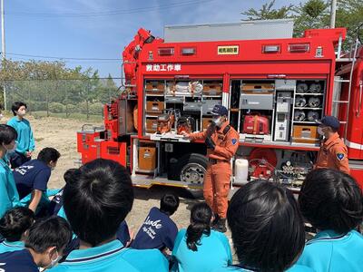 その後、消防車の中にある装備などを見せていただきながら、消防署員が出動した際にどんな活動を行っているのかを学びました。