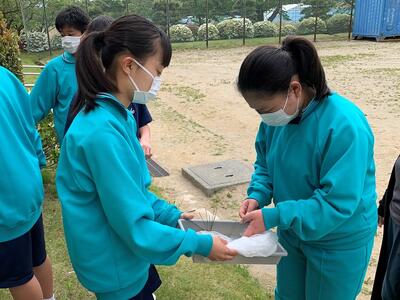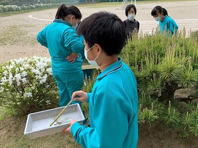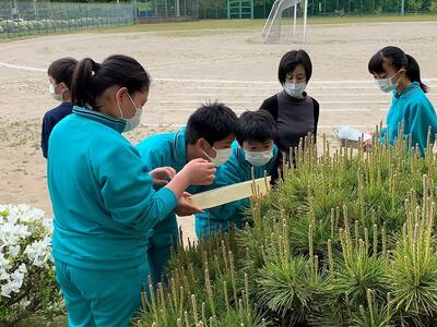 1年生の理科では「いろいろな生物とその共通点」という単元を勉強しています。今日は松の花を採取していました。1年生たちは、普段あまりじっくりと見ることはない松の花を、観察する学習でした。身近な植物も、ある特徴にもとづいて分類しようとすることで、探究のスタートになることでしょう。