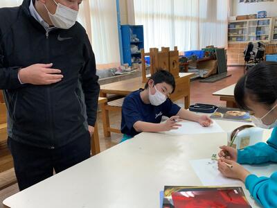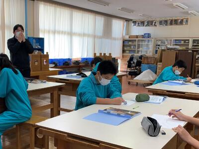 1年生の美術の授業の様子です。先生にアドバイスをもらいながら、自分の手を描いていました。
