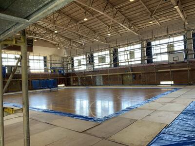 体育館は壁、天井見切、ギャラリー床を工事しています。