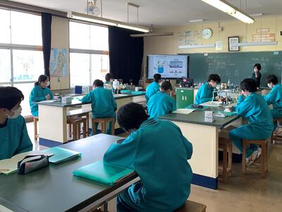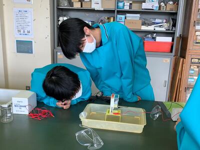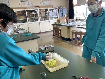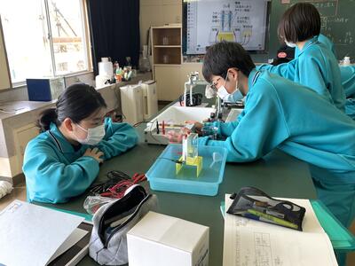 2022年4月18日 11時24分今日の3年生の理科では、「塩酸に電流を流し変化を調べよう」という授業を行っていました。先生の指示に従いながら、2,3人のグループそれぞれが器具を使って、塩酸の電気分解をしました。出てきた気体が水素かどうか、マッチで火をつけて確認していました。子どもたちは予想を口にしながら、興味深く実験に取り組んでいる様子でした。