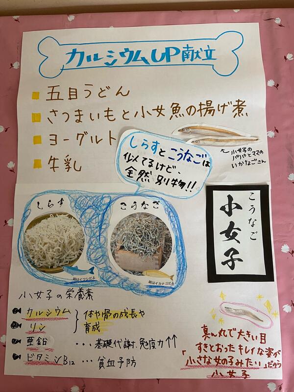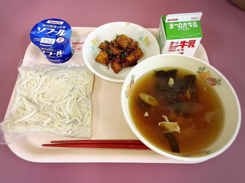 2023年4月12日 15時05分【カルシウムアップ献立】五目うどん さつまいもと小女子の揚げ煮 ヨーグルト 牛乳