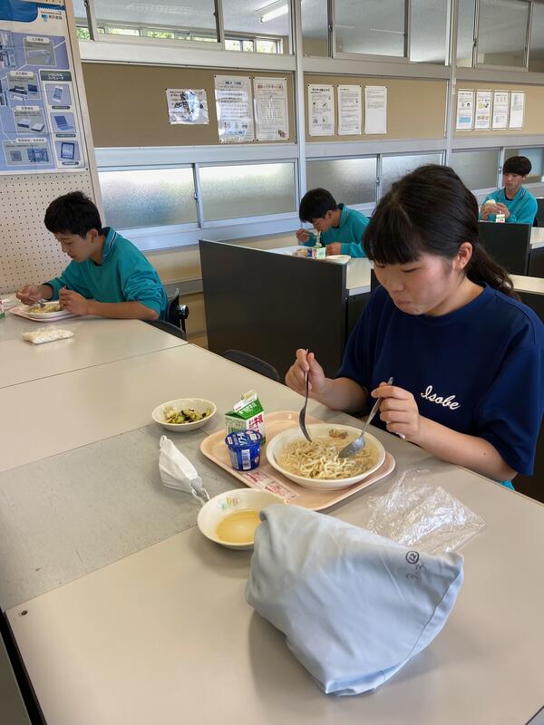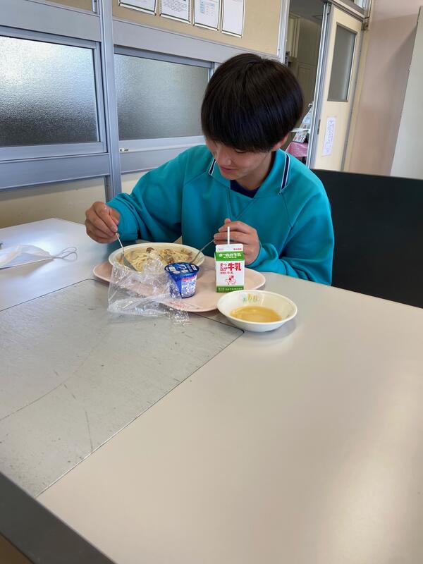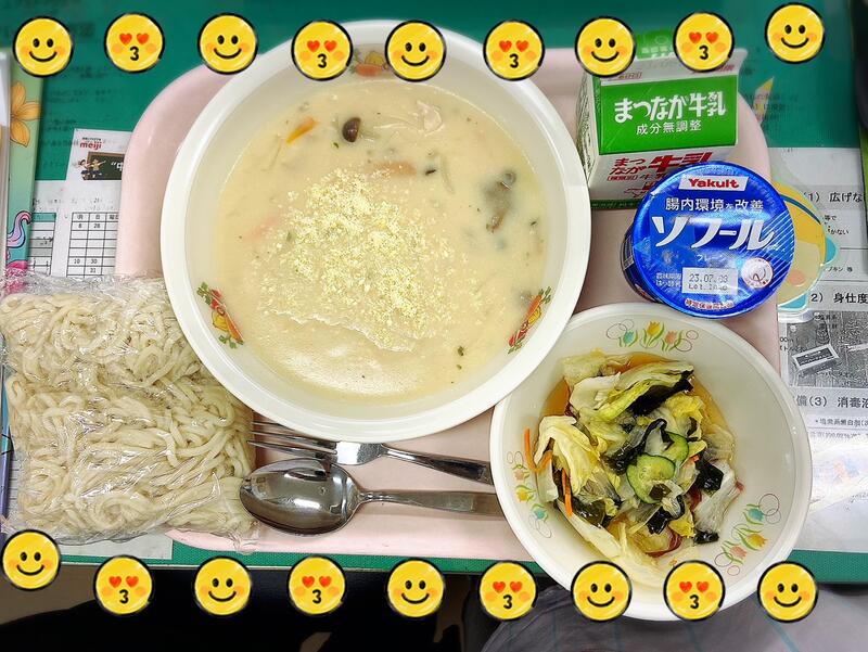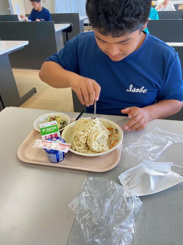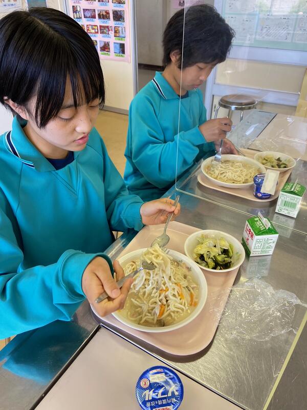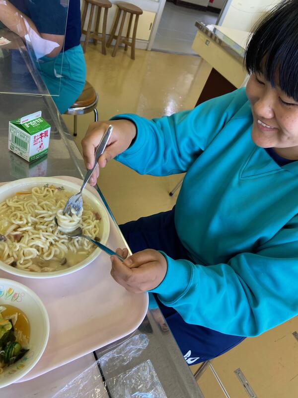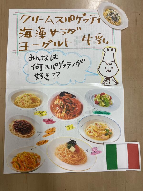 給食配膳のために並ぶ間、パスタ話でとちょっと盛り上がりました。子どもたちには「ナポリタン」「ペペロンチーノ」など王道シンプルパスタが人気でした。