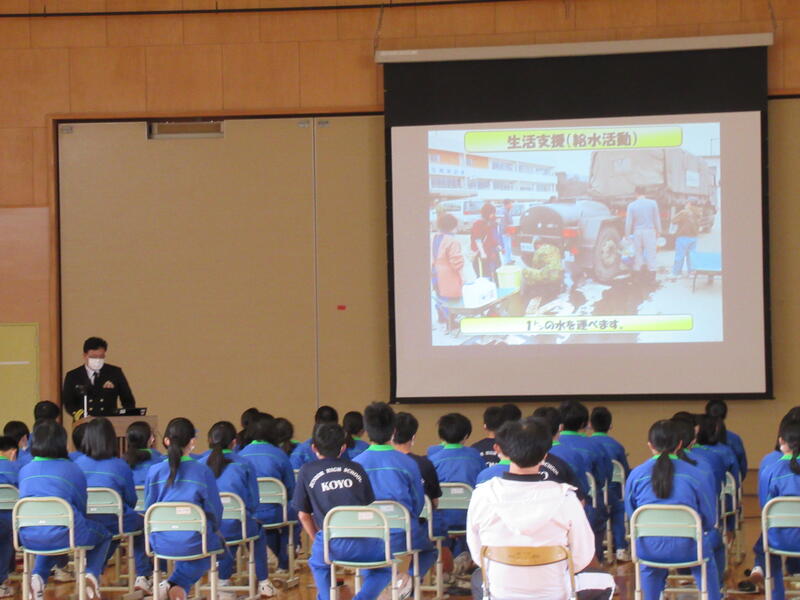 災害発生時にどのように行動したらよいのか、また、心がけるべきことは何かなど、自衛隊の活動をご紹介いただきながら、授業を行ってもらいました。