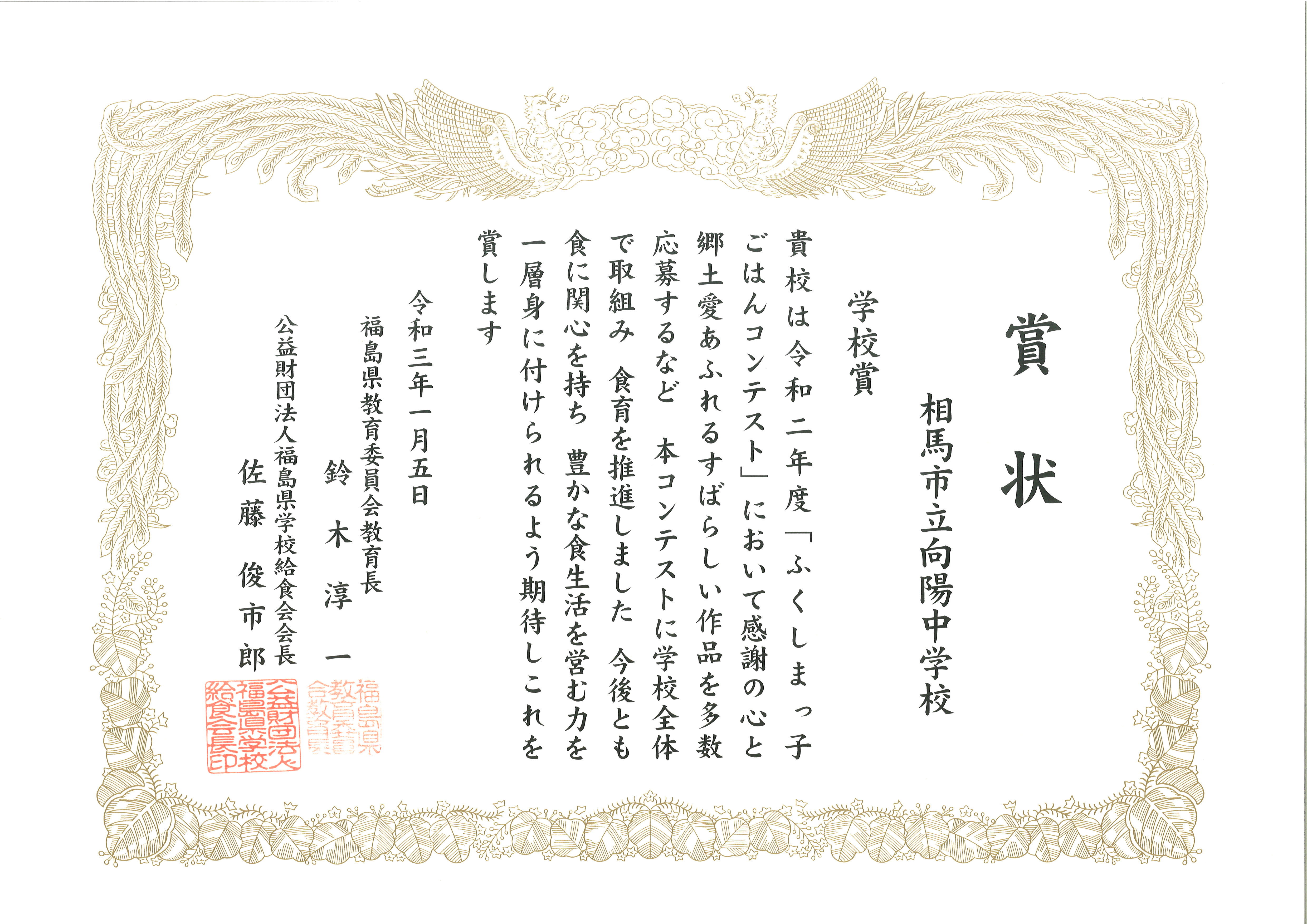 家庭科の授業を通して、福島県教育委員会主催の上記ごはんコンテストに多数の生徒が応募し、向陽中が見事「学校賞」をいただきました。主菜と副菜を組み合わせて、栄養バランスがよく、アイデアに富み、手軽に作れる弁当であることが主な条件でした。お子さんと一緒に考えたご家庭もあったことでしょう。食の大切さを考える良い機会となりました。