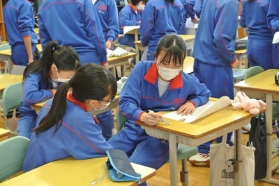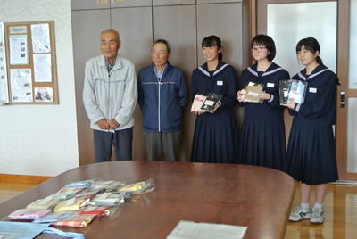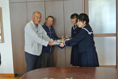 2020年10月15日 13時37分以前お知らせしていましたが、2年生の総合学習「地域に貢献しよう」で作製していましたエコバッグが完成(製作期間約3ヶ月半、110袋)しました。保護者や地域の方々から古布を提供していただき、それを活用してエコバッグ作りに取り組みました。地域の中で育てていただいている子どもたちが、恩返しの気持ちを込めて製作し、この度学校近くの向町の老人会に贈呈しました。ぜひ地域の皆さんに使っていただくようお願いし(メッセージを付けて)、手渡しました。「大切に使わせてもらいます。」と老人会会長、庶務・会計のお二人は大変お喜びになって、生徒たちの労を労っていただきました。JRC活動~「ありがとう」してあげて・してもらって~