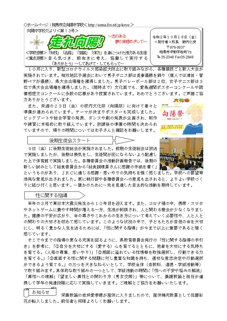2020年10月16日 09時39分本日学校だより第13号を発行しましたので、ご覧ください。