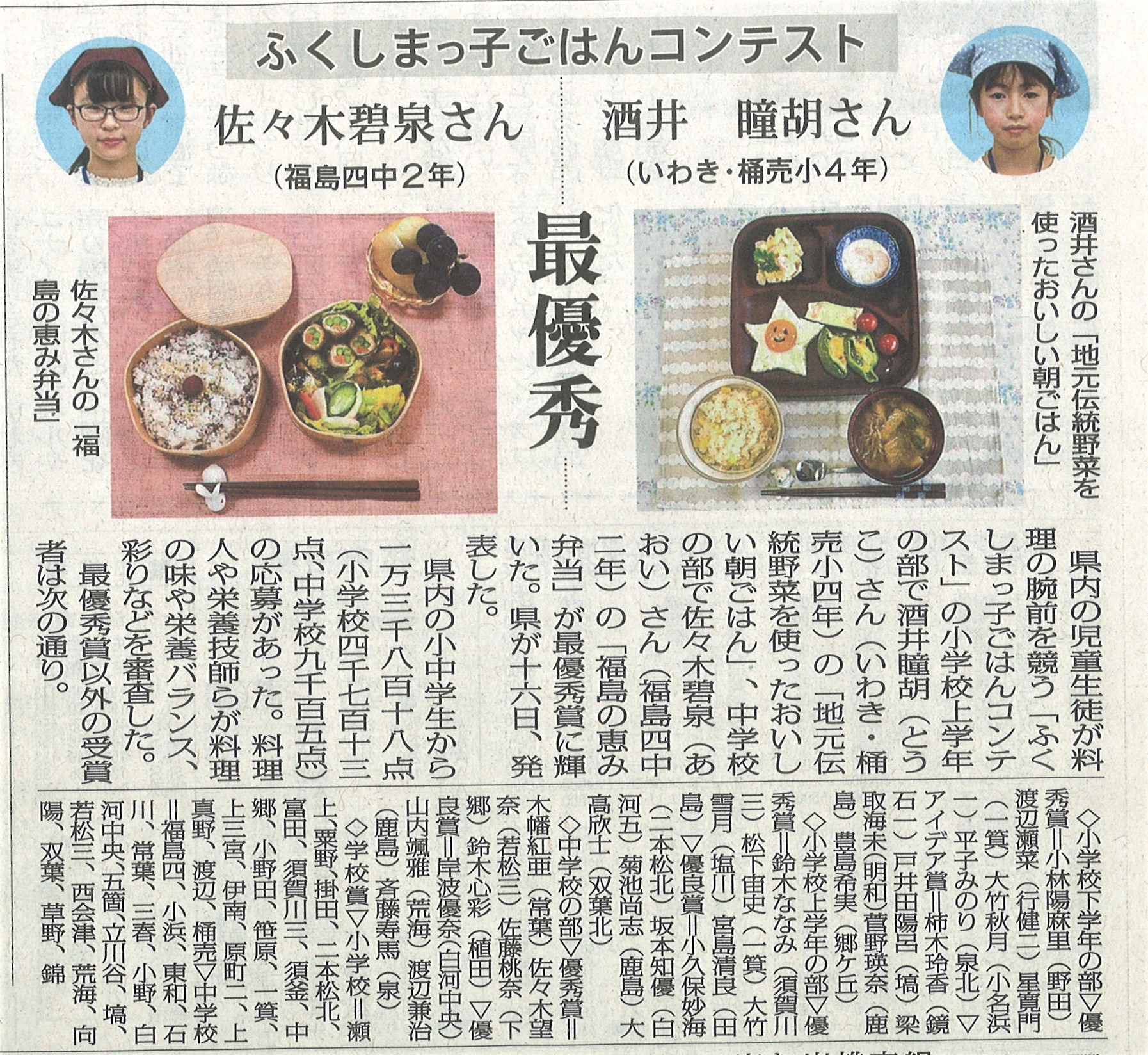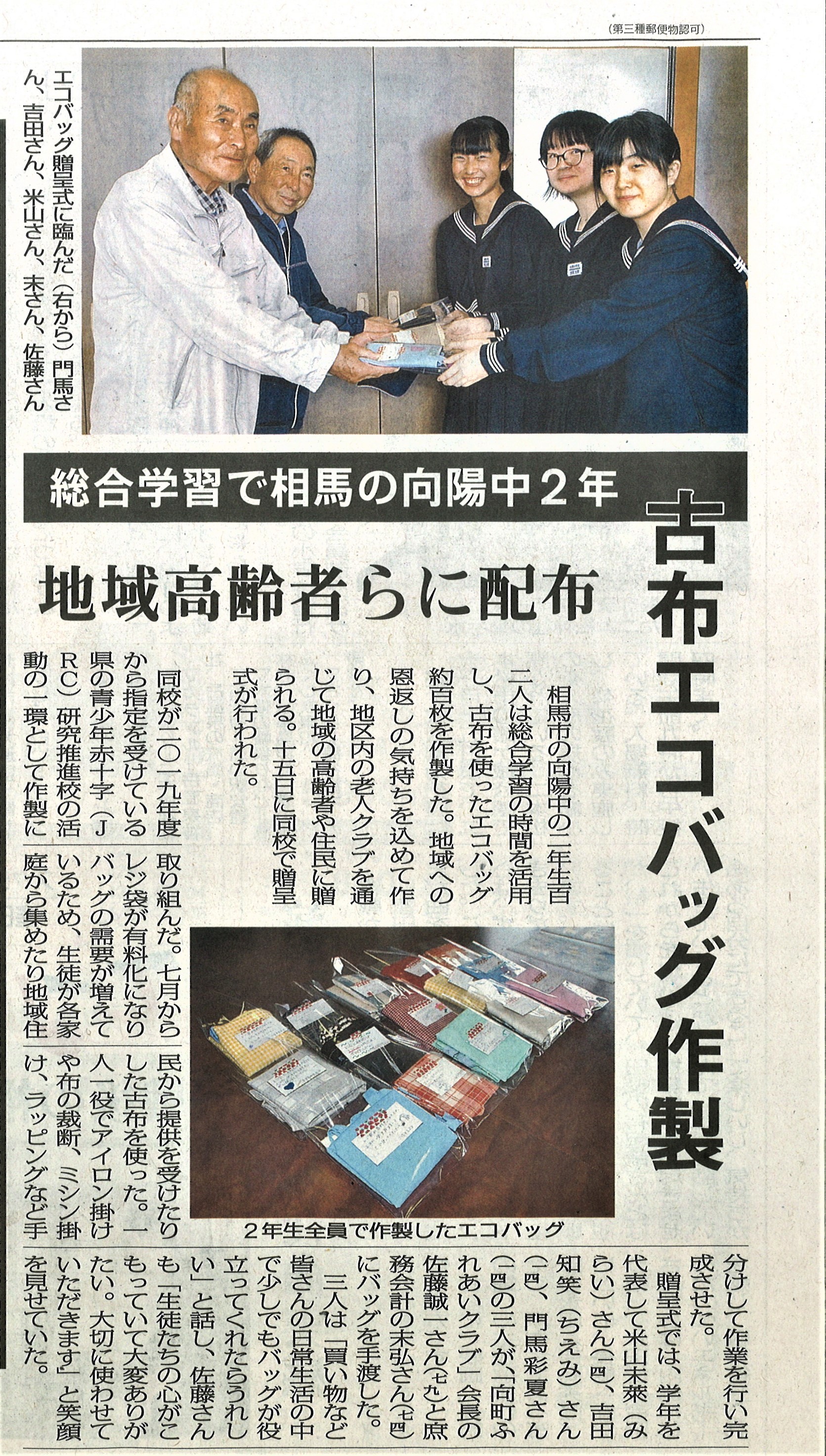 2020年10月19日 10時05分 10月17日付けの民報新聞に「古布エコバッグ作製」して地域高齢者の方々に配付した記事と「ふくしまっ子ごはんコンテスト」で向陽中が学校賞を授賞した記事が掲載されました。向陽中生頑張っています。