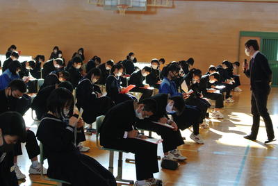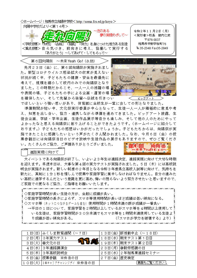 2020年11月4日 15時32分本日の午後から、河合塾NEXTから講師をお招きして、3年生対象に進路講演会を実施しました。「受験とは?」「試験とは?」「メンタル面」「福島県の高校入試傾向」等について、具体的に講話いただき大変参考になりました。明日は高校説明会があります。向陽祭も終わり、受験モード全開で進路実現に向かって頑張ってほしいと思います。