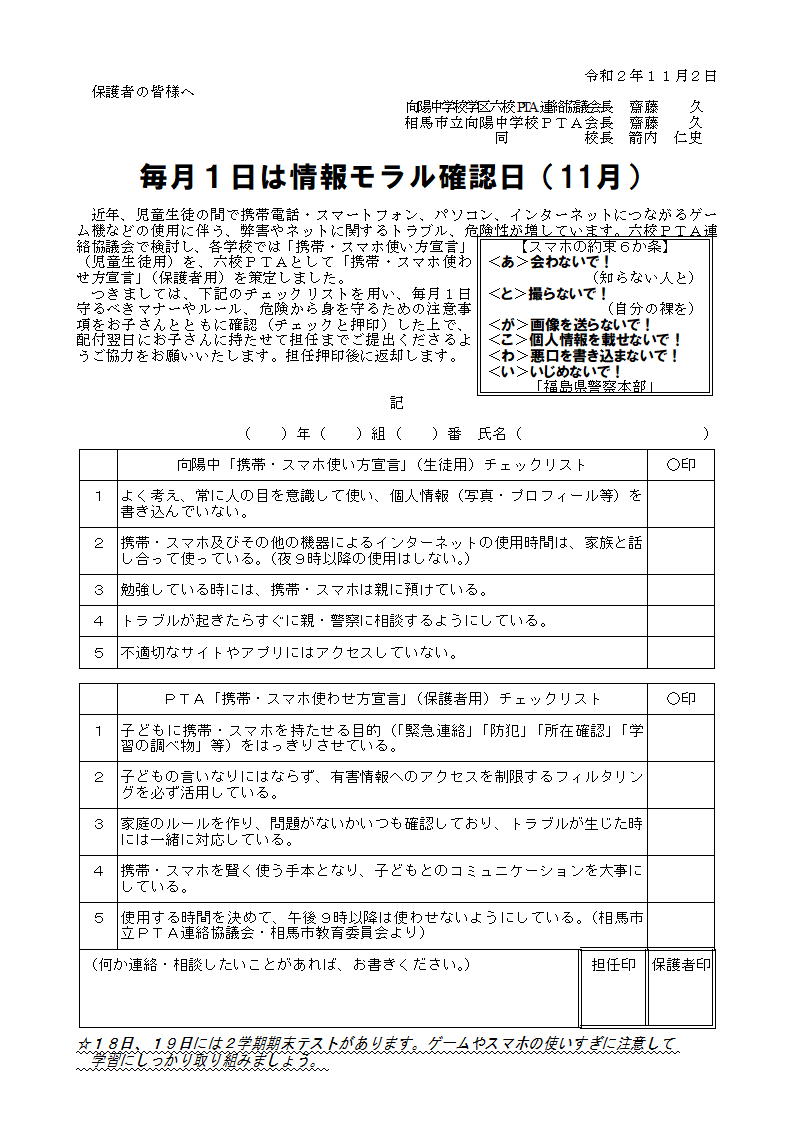 2020年11月2日 14時48分本日、上記のものを配付しましたので、ご覧ください。「毎月1日は情報モラル確認日(11月)」については、お子さんとスマホ等の使い方について確認して、押印の上担任までご提出をお願いいたします。