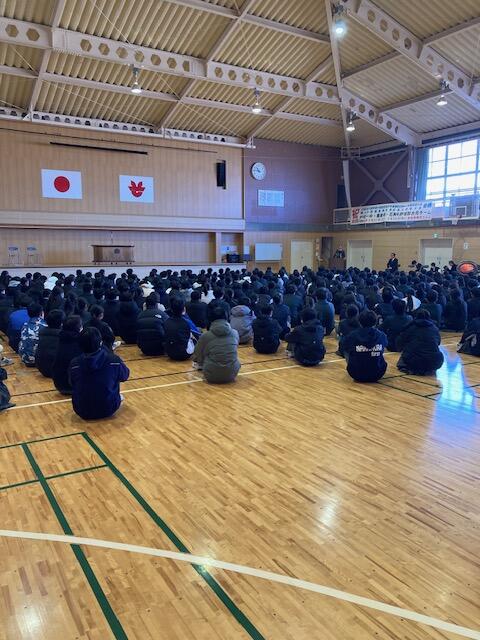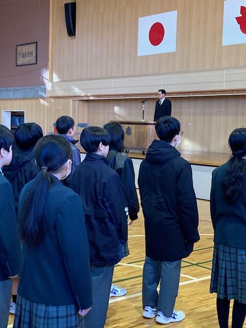 2025年1月8日 14時59分本日、令和6年度第3学期始業式が行われました。まわりでは、インフルエンザが流行しており、生徒の皆さんを心配していましたが、大きな影響なく今日を迎えることができました。今後も感染予防対策をしながら過ごしてほしいと思います。始業式後の全校集会では、各学年の代表生徒が冬休みを振り返り、1.2年生は、学習のまとめをしながら、進級の準備をすることや、3年生は進路実現に向けた最後の追い込みなど、3学期の目標をしっかりと発表することができました。