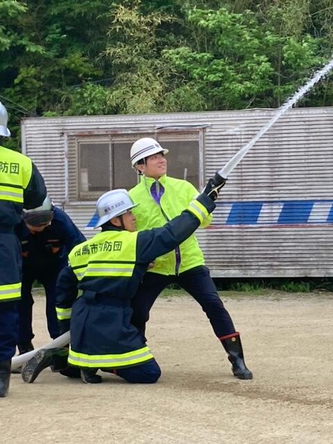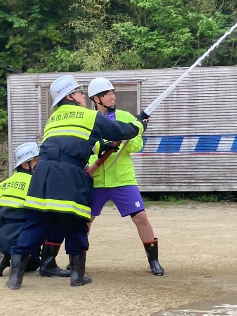 また、消防団による放水訓練がありました。団員の方にご指導いただきながら、教師・生徒それぞれ代表2名が放水を体験しました。