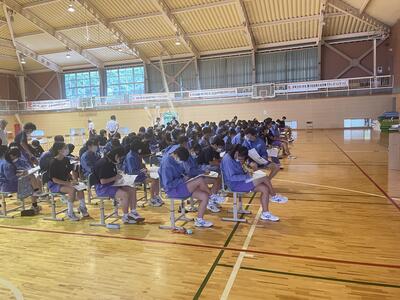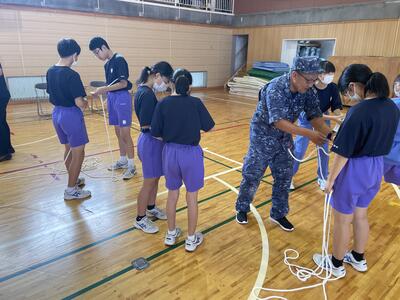 総合体験2日目の今日は、1年生が自衛隊による防災教室を、2年生は引き続き職場体験を、3年生は高齢者福祉と障害者福祉についての講話を行っています。普段の授業とは違う貴重な経験を得ることができたようです。