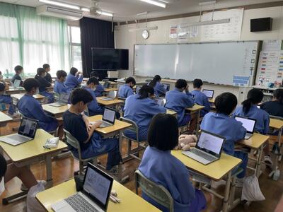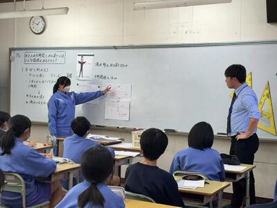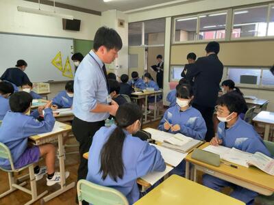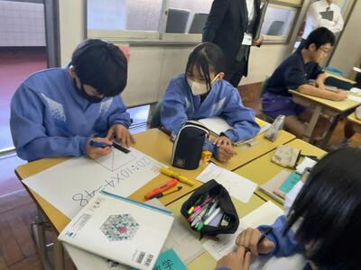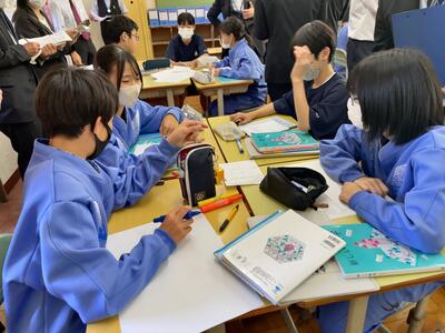本日5校時目に、域内の先生方をお招きして授業研究会が行われ、1年3組の数学の授業を参観いただきました。14名ほどの先生方が来校し、算数・数学の学力向上に向けた授業改善の視点や方策について協議しました。